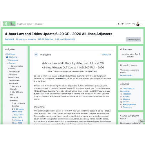 4 hr Law & Ethics Update + 6-20 All-Lines Adjusters (2026) CE Course (4 hr credit)